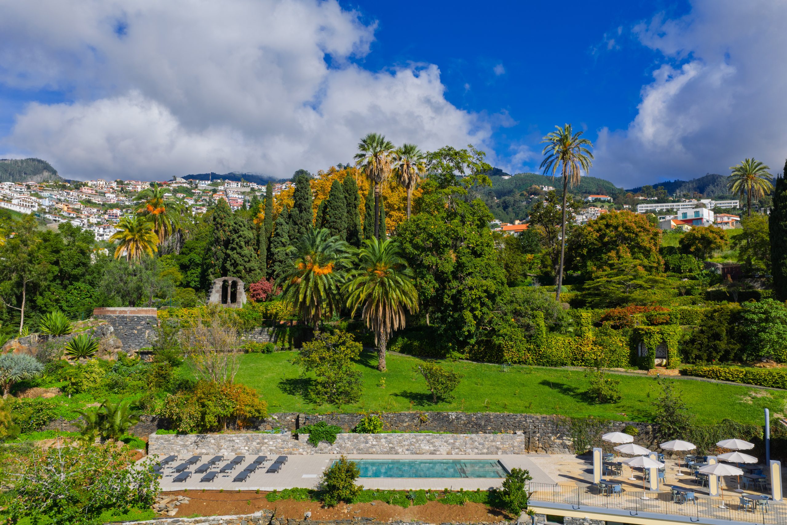 A parte superior, em frente à casa, é a mais antiga do jardim. Aqui podem encontrar plátanos e cânforas monumentais, um til antigo Octoea Foetens e um Taxodium Disticum dos pântanos da Louisiana. Mais abaixo, uma avenida atravessa o jardim de leste a oeste. A encosta é plantada com agapantos, que florescem no início do verão, mas também podemos avistar vários Doryanthus, lírios-lança grandes e espetaculares, com suas grandes flores vermelhas. Os jardins abaixo da avenida foram projetados pela esposa de Hinton, Isabel Vasconcellos, no início do século vinte. A oeste, podem avistar o relvado de croqué, ao lado do qual encontrará uma alameda de ciprestes, que vos leva até a Janela de Colombo: uma estrutura de pedra que veio da casa onde Cristóvão Colombo se hospedou na ilha. A leste, está o lago de borboletas, de onde um caminho curvo cruza mais dois níveis de jardins chegando ao roseiral, com seu mirante de glicínias. Na parede da estrada, ergue-se o exótico Combretum com suas flores vermelhas. Descendo os degraus suculentos, chegamos ao piso inferior, com seu pomar de citrinos e uma alcova decorada com cacos de pratos da fábrica da Sacavem.