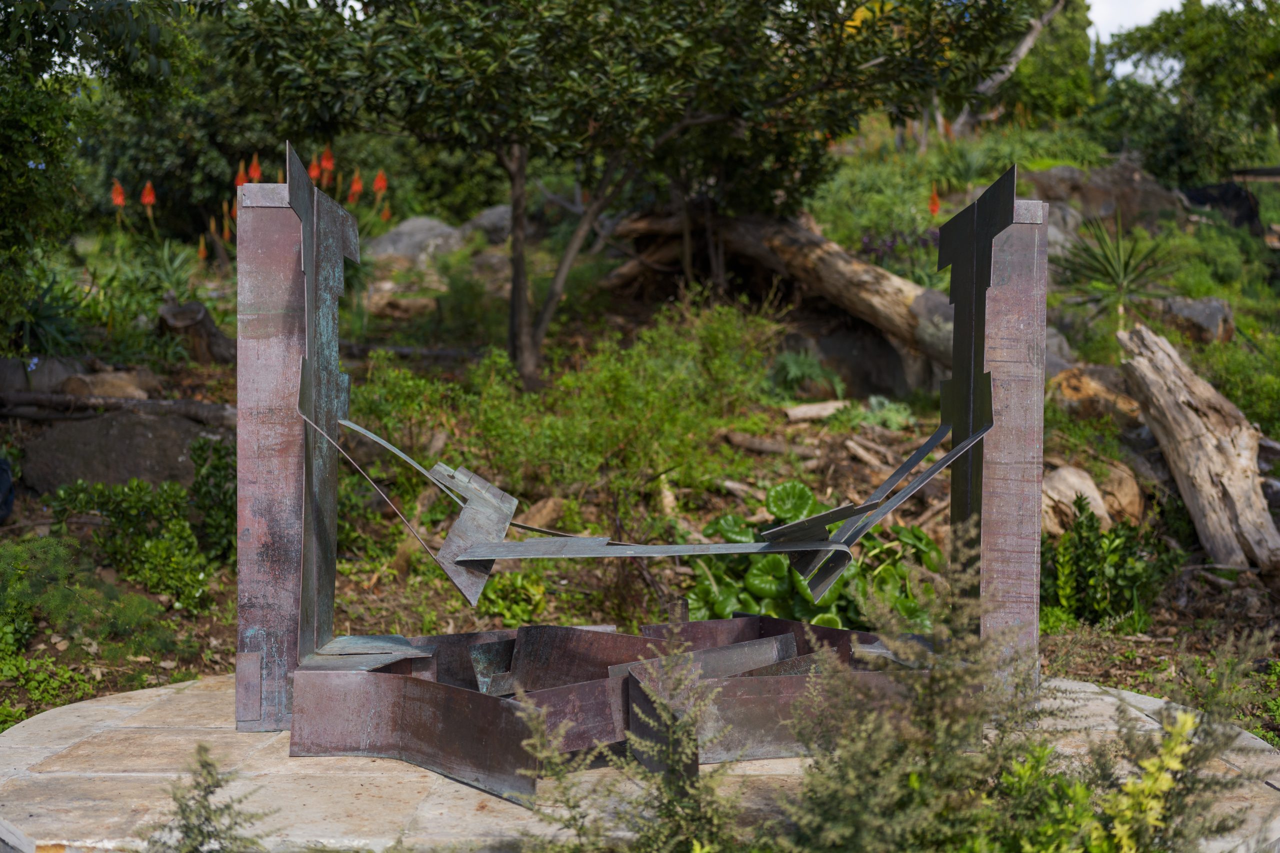 A parte inferior do jardim foi baptizada ‘Austrália’ por Theo Welsh, avó do proprietário, não apenas por estar localizada nos ‘confins’ da propriedade, mas também porque ela introduziu muitas plantas de sua terra natal, a Nova Zelândia, e da Austrália. Esta área foi totalmente devastada pelo incêndio de 2016, que atingiu o centro do Funchal. Apenas uma falange de estrelícias e o eucalipto gigante com aroma de limão resistiram praticamente ilesos. A área foi replantada num estilo mais natural e rebaptizada bosques de Te Whiti, em homenagem ao ativista Maori que foi pioneiro em técnicas de resistência não-violenta. A oeste, encontramos jovens Podocarpus Totora da Nova Zelândia, um cedro-do-atlântico, uma Schotia e diferentes Magnólias, bem como duas amoreiras que facilmente superaram todas as suas rivais. No lado oposto, fetos arbóreos endêmicos prosperam na sombra e os dragoeiros estão retornando. No final do caminho que desce da Janela de Colombo, chegamos ao Monumento de Simulanbuco – Estátua da Autodeterminação, da autoria do escultor madeirense Silvio Cró. Daqui, pode-se avistar o pomar de romãzeiras, abacateiros e caquis à sua esquerda, enquanto pela frente estende-se uma plantação de helicónias e proteias, com, claro, a cidade e o porto ao fundo.